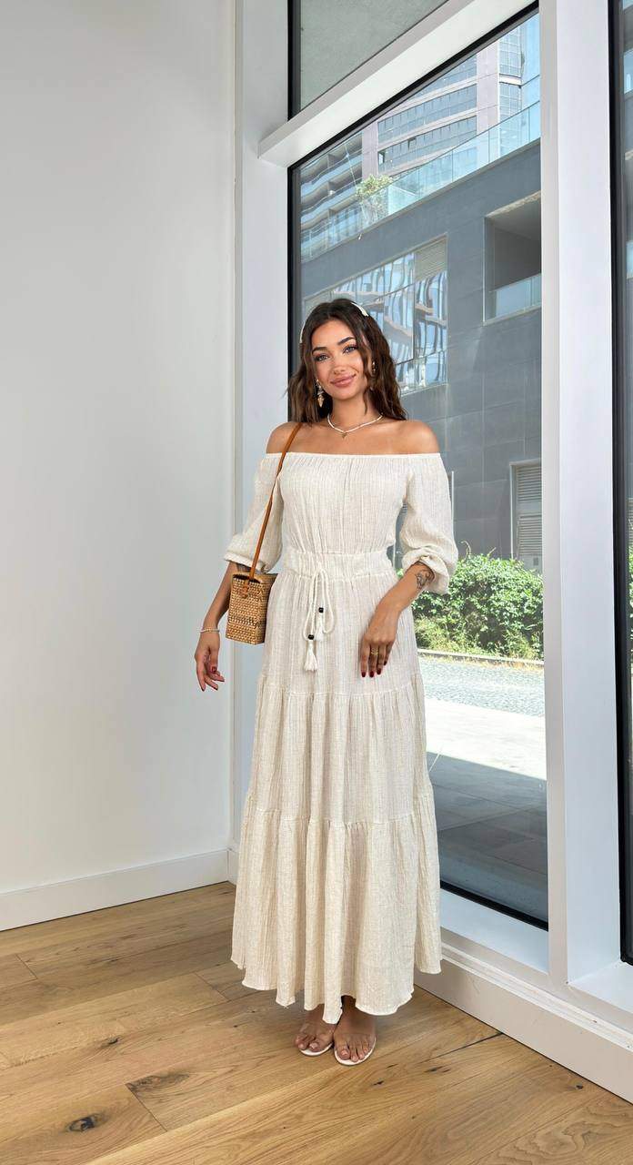 3985 KETEN BELİ LASTİKLİ ELBİSE AÇIK BEJ
