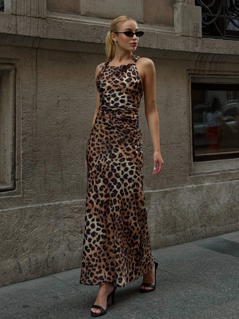 4043-1 SATEN LEOPAR UZUN ELBİSE HARDAL